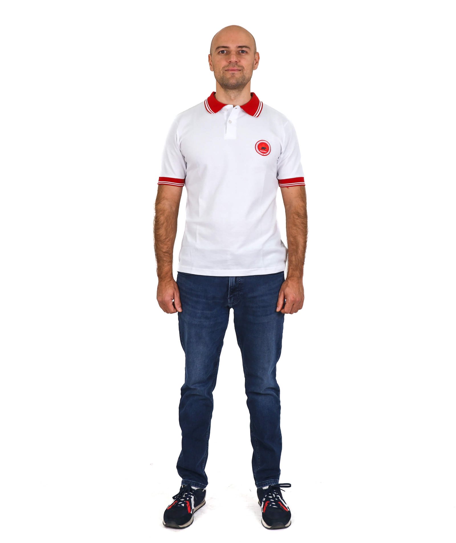 Details: Classic Unisex White Polo T-Shirt featuring a red collar and sleeves, with dual white stripes.
