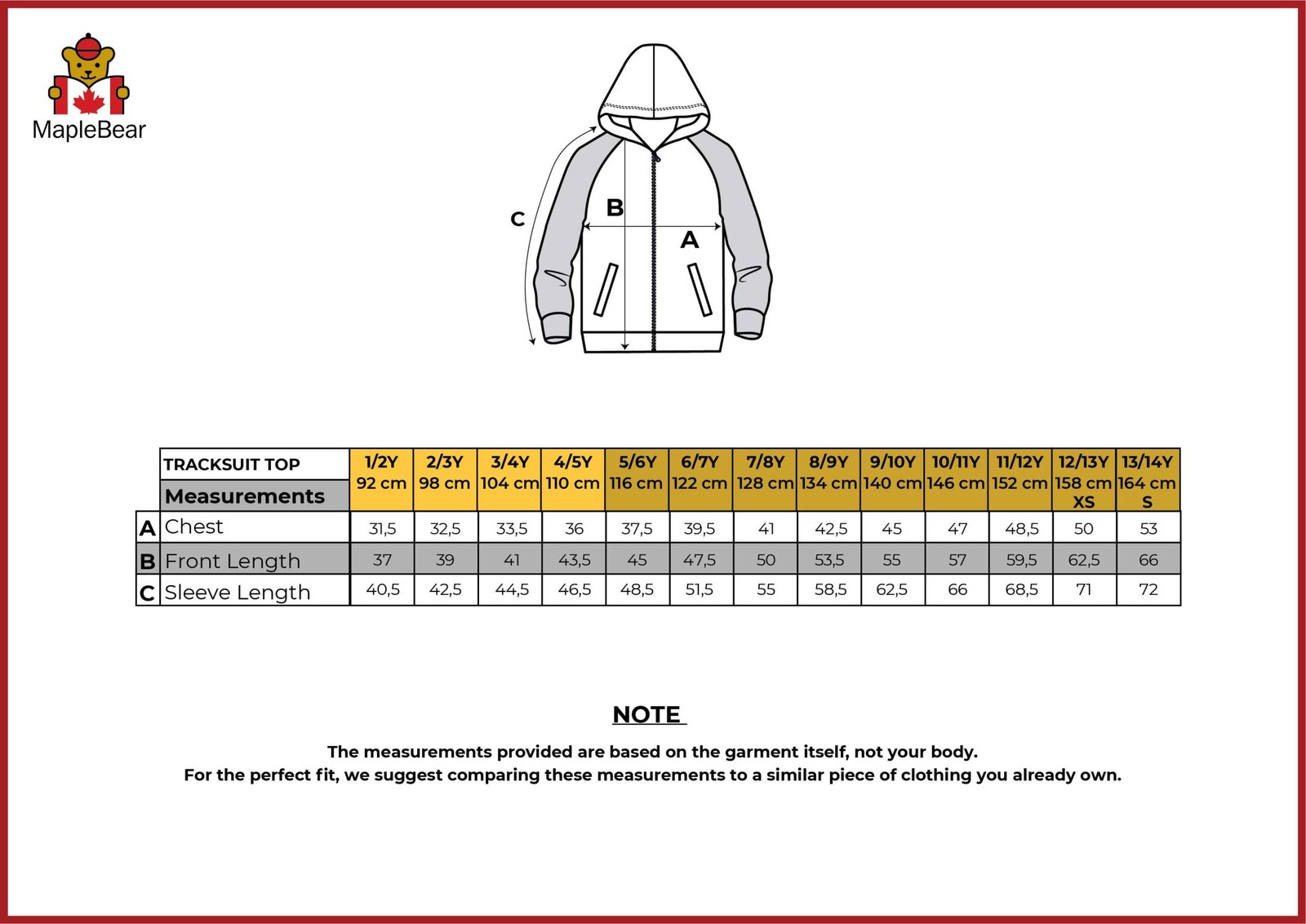 The size chart is in centimeters.