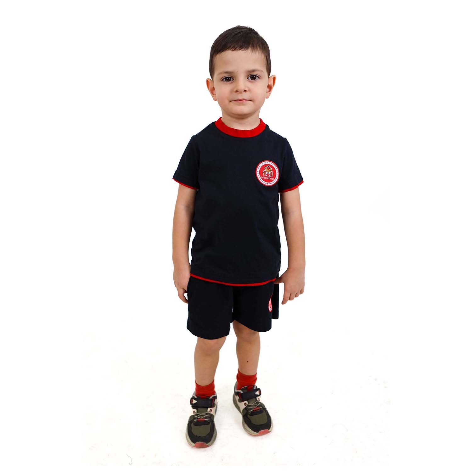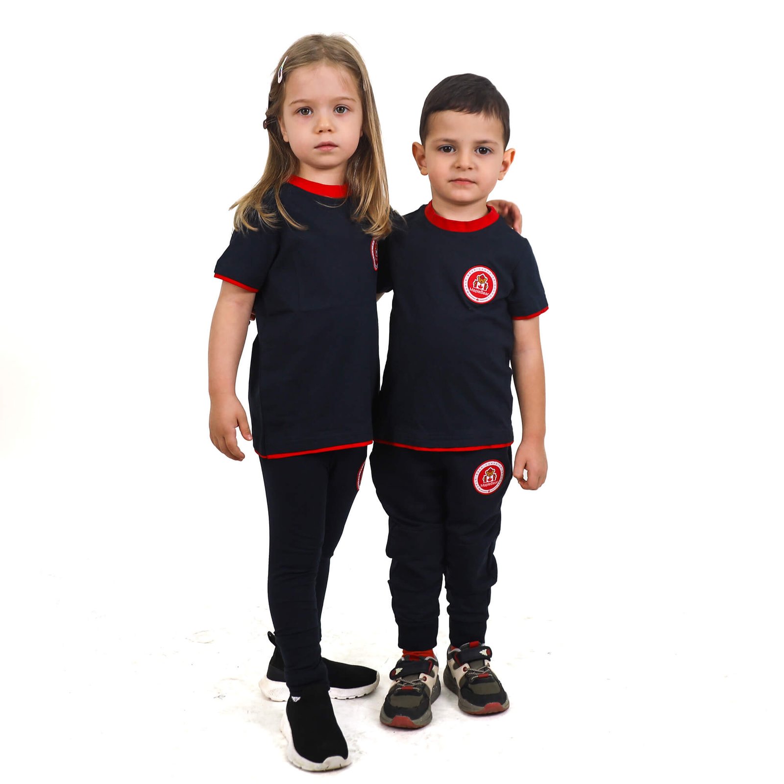 Details: Unisex Navy Blue T-Shirt featuring red piping along the neckline and sleeve edges.
